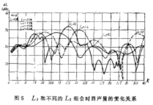 雙腔擴(kuò)張式消聲器,在插入長(zhǎng)度分別等于1/2和1/4腔長(zhǎng)時(shí)的它的消聲量,在某些頻段總會(huì)出現(xiàn)一些低谷,綜合比較各種腔長(zhǎng)組合而成的消聲器共消聲量的變化曲線,還是雙腔長(zhǎng)度比較接近或相等時(shí),消聲量的變化曲線比較平緩,有效頻段也較寬。即使在某些頻段出現(xiàn)低谷,其頻率也較窄。